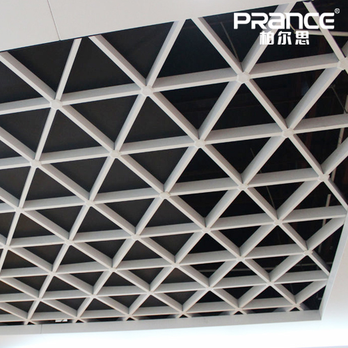 第二種為鋁型材三角格柵吊頂系統(tǒng)主要有鋁通、鋁柱及鋁蓋三部分組成,組裝款式有三角型和六角型。鋁型材三角格柵的型材方通的厚度一般為0.8mm、0.9mm、1.0mm,方通規(guī)格為25*50mm、25*75mm、30*80mm、25*100mm、40*80mm及40*100mm,三角形格子的大小可定制150*150mm、200*200mm、250*250mm、300*300mm、400*400mm、500*500mm、600*600mm及800*800規(guī)格,表面涂層一般選擇粉末靜電噴涂或聚脂漆噴涂,也可選用輥涂、拉絲表面處理。常用顏色為乳白色、黑色,也可根據(jù)要求訂做其它顏色。不同的顏色搭配可以表達(dá)出不同的個(gè)性特點(diǎn)。